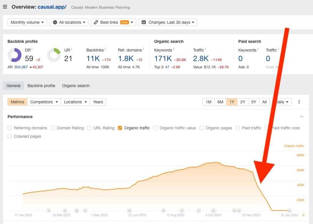 However, don’t be tempted to go to the dark side and let AI write your content. That’s what happened to Causal. They partnered with Byword, an up-and-coming AI content generator, in 2021 to create AI-exclusively generated SEO-focused content. Their success story was highly touted until a drastic drop in organic traffic occurred - from 650k to 3k monthly visitors within 30 days.