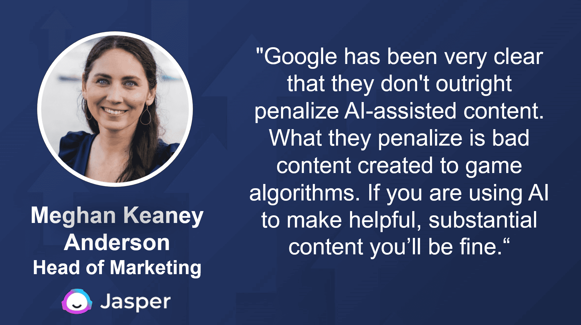 Google isn’t saying don’t use AI tools; just don’t exclusively use AI to write your entire blog. According to Meghan Keaney Anderson, Head of Marketing at Jasper, "Google has been very clear that they don't outright penalize AI-assisted content. What they penalize is bad content created to game algorithms. If you are using AI to make helpful, substantial content you’ll be fine.“