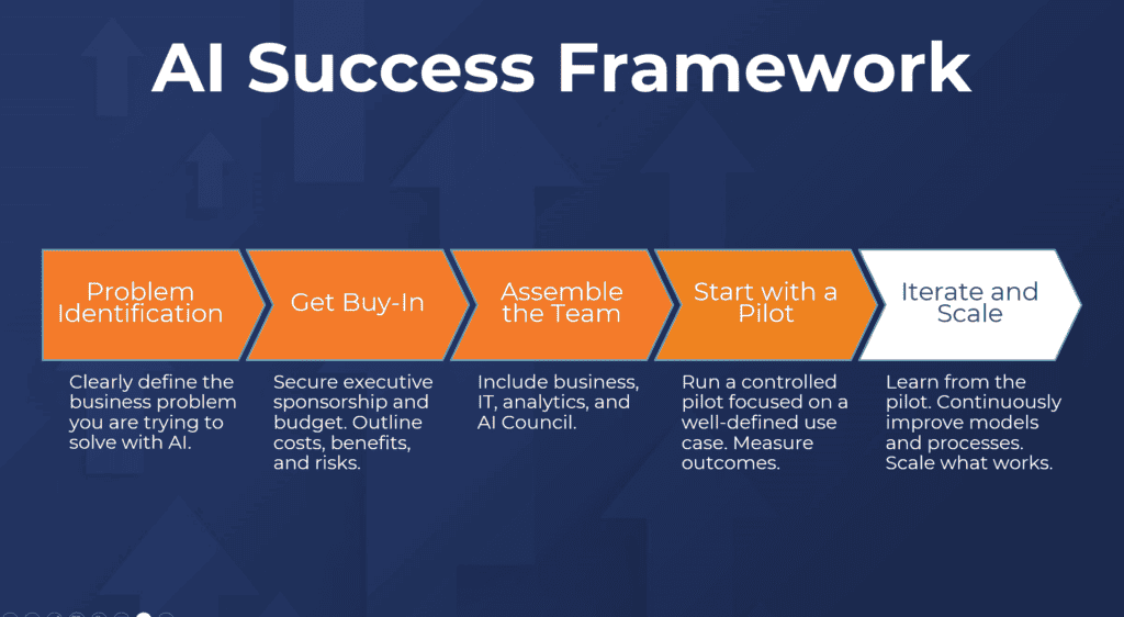 Embracing these steps will help move you, your team, and your company toward AI readiness. When ready to integrate AI deeply into your company, follow this AI Success framework to evaluate, pilot, and scale your business forward.