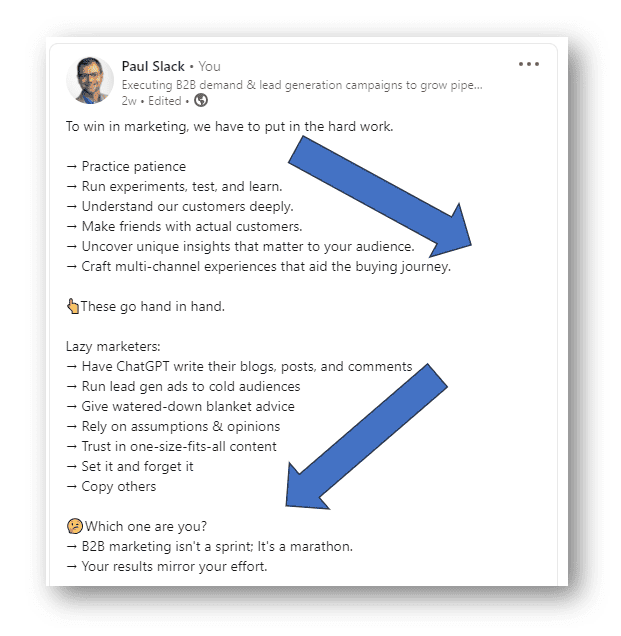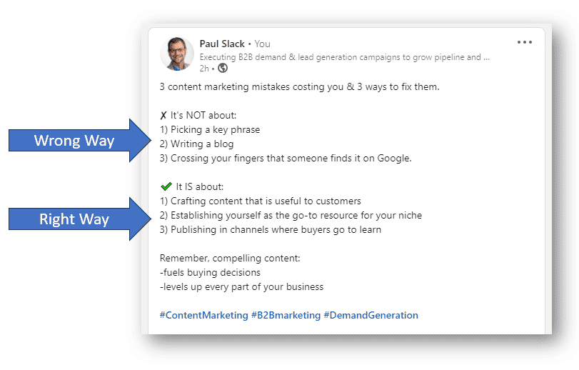 Leverage the “Before & After” or “Wrong Way/Right Way” Approach - Showing a poor example contrasted with an improved example is highly engaging on LinkedIn, warning people what not to do and demonstrating a better approach to keep attention.