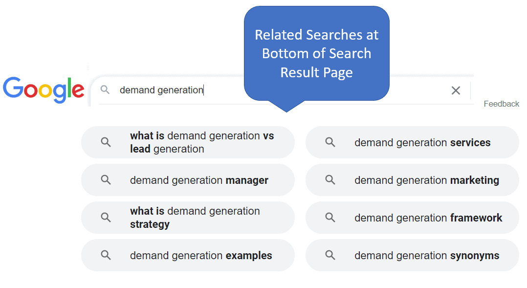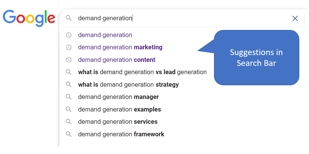 - Type your content pillars into Google to identify related topics. The suggestions Google serves up come from how people actually search for the pillar term. In the example below, you can see all the different ways our prospects search for information related to “Demand Generation.”