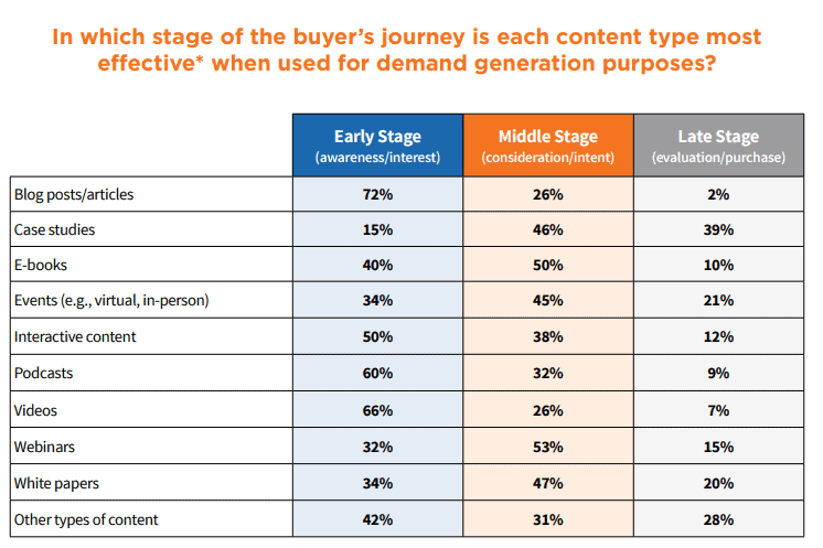 Less is more here. It is better to create fewer solid content items tied to your Pillars that are really helpful for the buyer than to create a lot of watered-down fluff pieces. For example, at Vende Digital, we write 1-2 blogs each month like this one. However, it is critical to repurpose your content into formats that matter to your ICP. In the chart below, you’ll see all the different formats that are consumed by B2B buyers at different stages. We’ll discuss this in more detail in Step 4.