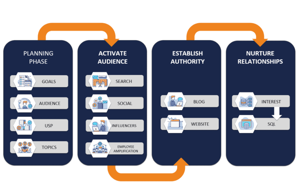 - A focus on driving prospects to your website so that you can establish authority and empathy.