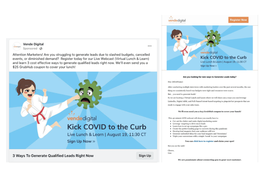 With our “Kick COVID to the Curb” campaign, our messaging and landing page all had the same look and feel. This allows your audience to connect the dots and smoothly transition from the ad to the page.