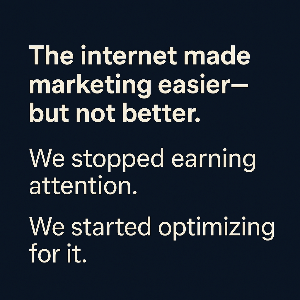 For a while, the internet made marketing easier, but not better. It created a shortcut to buyer attention. We didn’t have to be good; we just had to be at the top of Google. With the right keywords, any company could show up. We stopped earning attention and started optimizing for it.