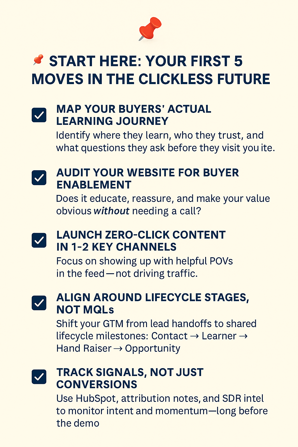 In the clickless future, we obviously can’t track every step. Therefore, we have systems that respond to the steps buyers are actually taking. When you measure what matters, you give your team permission to play the long game—to earn trust, stay visible, and fuel the pipeline without obsessing over every click.