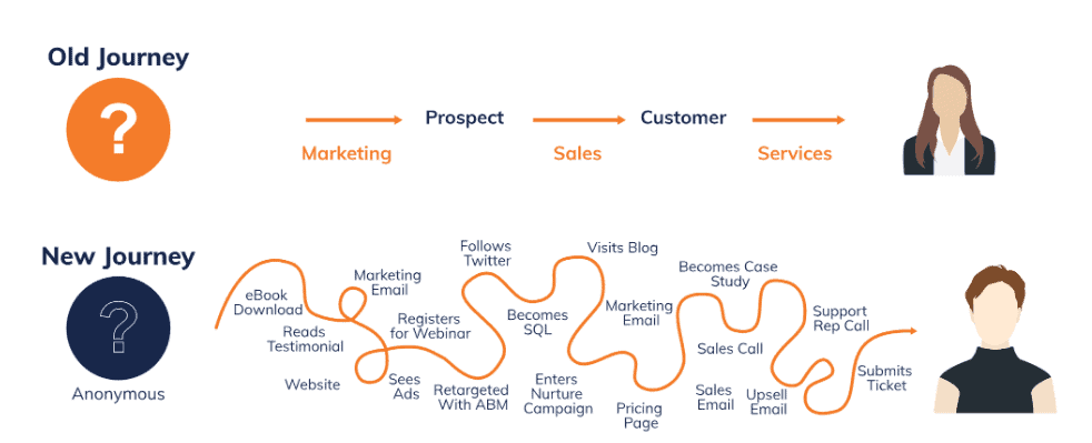 As depicted below, buyer behavior has significantly changed, making marketing attribution more difficult. Today's buyers may start as anonymous website visitors and interact with multiple marketing touchpoints before becoming a “hand raiser” ready to talk to sales. This complex journey presents a challenge for attribution, often leading to leaks in capturing the full value of each interaction. Recognizing the nuances of modern customer engagement is crucial in avoiding the misallocation of marketing resources and ensuring the success of marketing strategies.
