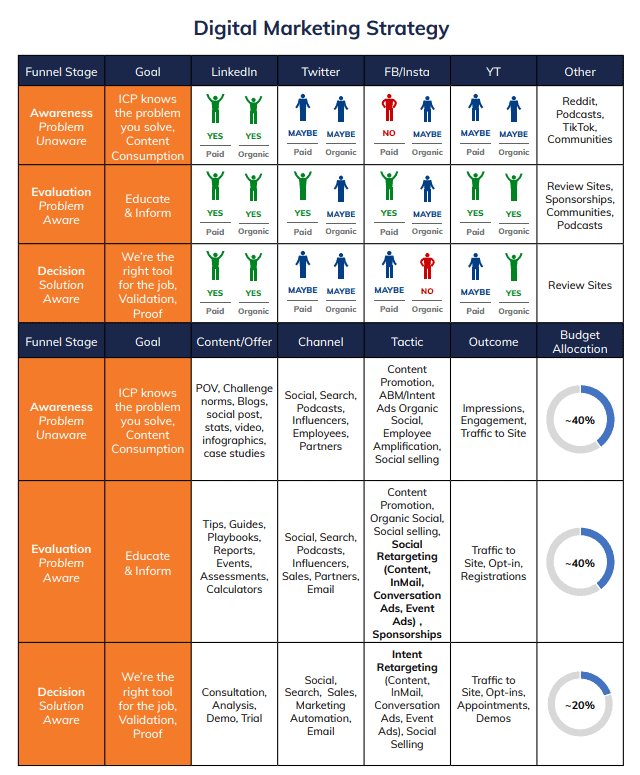 To maximize the impact of your ABM efforts, make sure you create content that is focused on helping your prospects solve their problems. It’s important that marketers are providing buyers with the right content to help them along their journey, amplifying why your product or service is valuable to them, and demonstrating how it will help them navigate or alleviate a pain point. In doing so, you will position your company as an authority for them to turn to. Use the following matrix to help you plan the best channels and content for your campaigns.